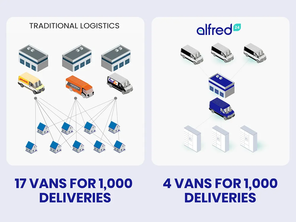 Traditional e-commerce logistics require the equivalent of 17 CO2-emitting vans per 1,000 deliveries, while alfred24 requires the equivalent of just four.